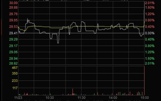 2011年11月23日臨近收盤期間(14:56:24至14:59:28),任某某為了在短期內(nèi)拉升股價,大量申報買入“X”4筆共計63,000股,占尾市階段市場申買量的比例高達(dá)75.54%;委托價格由29.60元升至32.00元,每筆均高于當(dāng)時市場上的買1檔價格,三分鐘內(nèi)將股價由29.35元拉升至30元收盤,拉升幅度達(dá)2.21%。(見下圖)