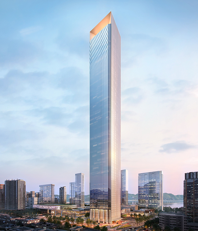 建筑高度:380m(79層) 幕墻面積:13.9萬m2 項目設計:SOM建筑事務所/浙江綠城建筑設計有限公司 幕墻類型:單元式玻璃幕墻、編制式單元幕墻等