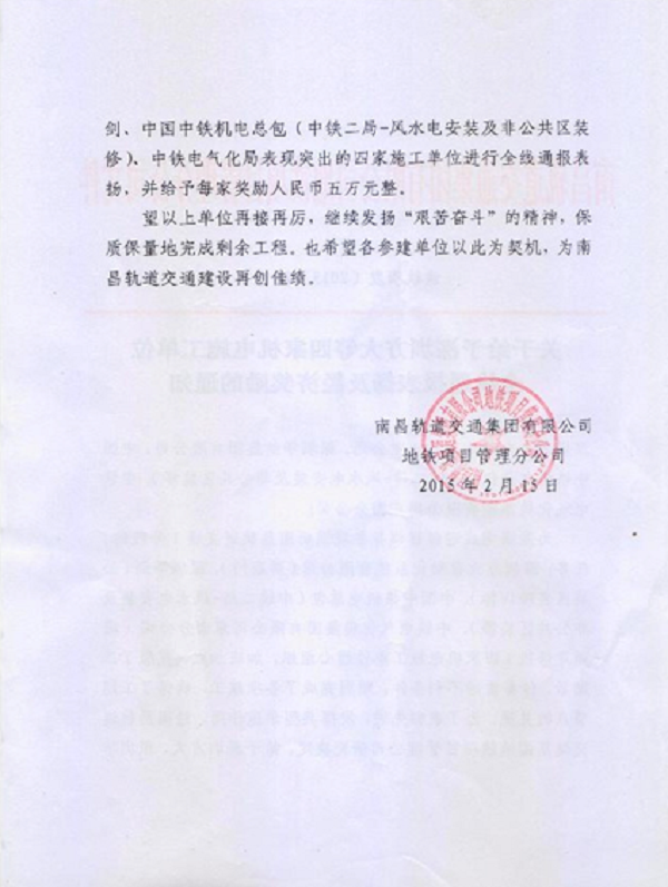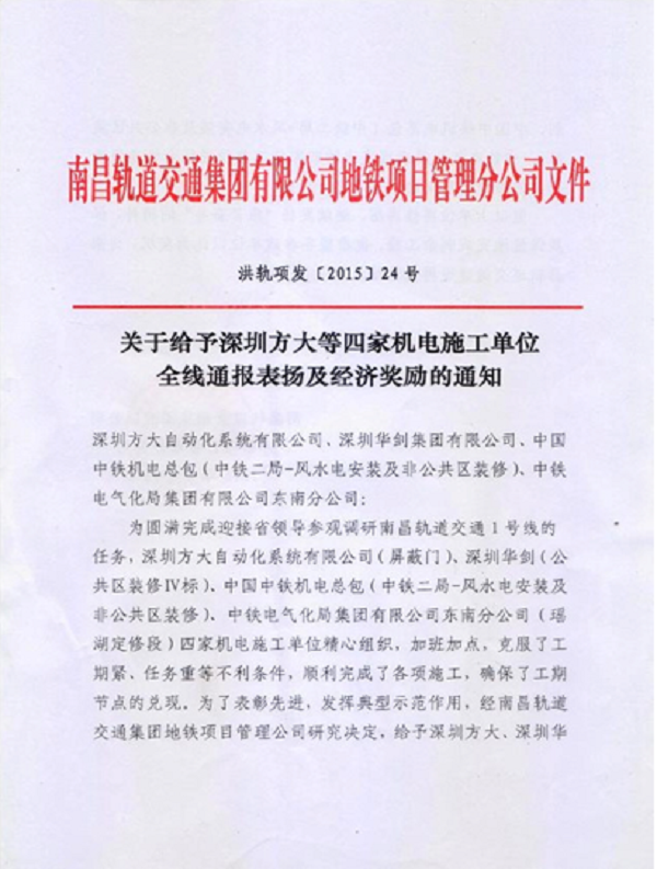 新年伊始,方大自動(dòng)化公司再次喜獲嘉獎(jiǎng)。南昌軌道交通集團(tuán)為表?yè)P(yáng)先進(jìn),決定給予深圳市方大自動(dòng)化系統(tǒng)有限公司等四家施工單位通報(bào)表?yè)P(yáng)。并給予五萬(wàn)元獎(jiǎng)勵(lì)。
