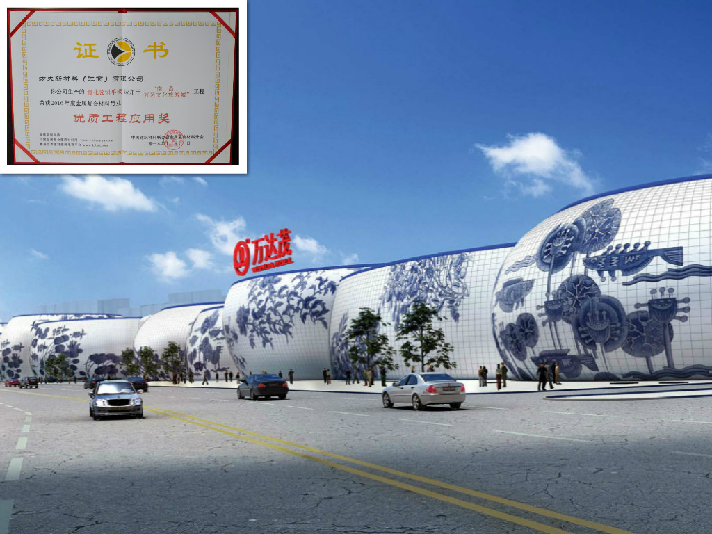 方大青花瓷鋁單板應用于南昌萬達文化旅游城,榮獲2016年度金屬復合材料行業(yè)“優(yōu)質(zhì)工程應用獎”