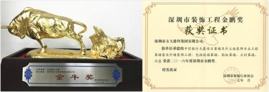近日,由方大集團全資子公司深圳市方大建科集團有限公司(簡稱:方大建科)承建幕墻工程的深圳中信銀行大廈分別獲得由深圳市建筑業(yè)協(xié)會頒發(fā)的金牛獎、由深圳市裝飾行業(yè)協(xié)會頒發(fā)的金鵬獎兩項榮譽。