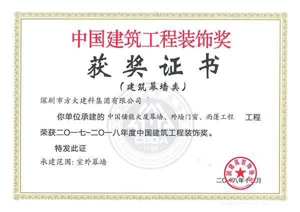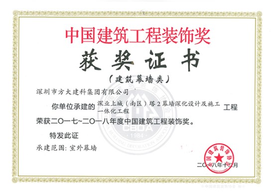 近日,中國建筑裝飾協會頒發了2017-2018年度中國建筑工程裝飾獎的獲獎證書,方大集團股份有限公司全資子公司深圳市方大建科集團有限公司承建的四項幕墻工程榮獲中國建筑工程裝飾獎——方大廣場(一期)、深業上城(南區)塔2、中國儲能大廈、中國南方電網有限責任公司生產科研綜合基地。