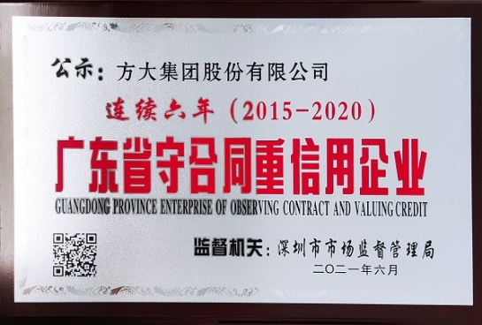 方大集團(tuán)成立以來,堅持強(qiáng)化合同守信意識和品牌意識,從嚴(yán)把關(guān)、達(dá)誠申信。公司連續(xù)6年獲得“廣東省守合同重信用企業(yè)”榮譽(yù)稱號,是市場監(jiān)管部門和社會各界對公司長期以來誠信履約、信義為本的經(jīng)營態(tài)度的高度認(rèn)可。公司將繼續(xù)強(qiáng)化企業(yè)信用管理體系,誠信履行合同,提高市場競爭力,為構(gòu)建更加規(guī)范和諧的市場經(jīng)濟(jì)環(huán)境做出積極貢獻(xiàn)。